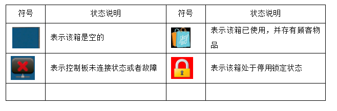 每个刷卡寄存柜都有显示屏,如果显示屏上出现以下图标,顾客可以根据以下标志及状态说明,了解寄存柜的使用状态,避免出现寄存柜使用障碍。