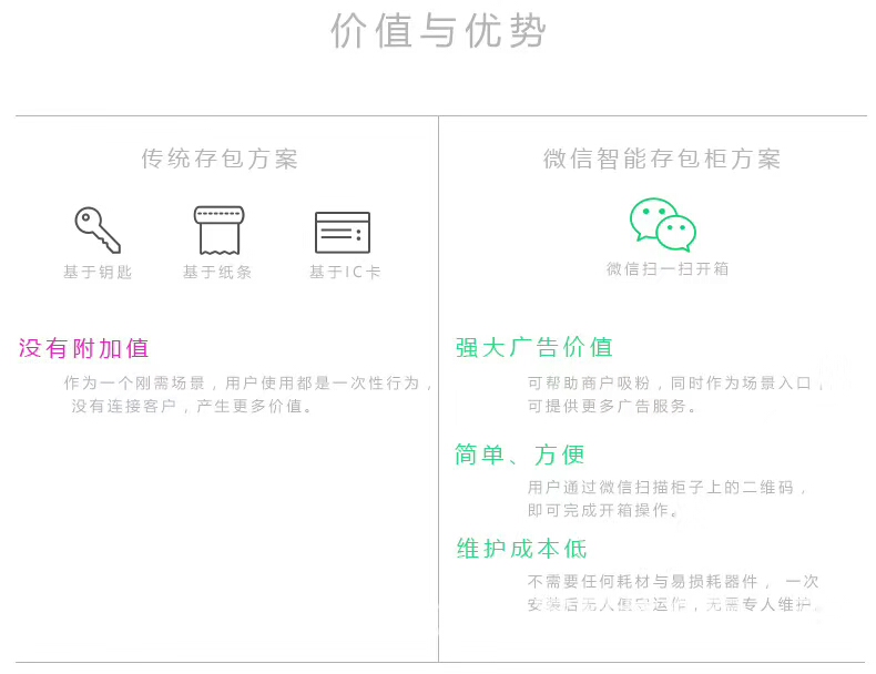 产品功能:存包:通过微信"扫一扫"功能实现开柜存包功能