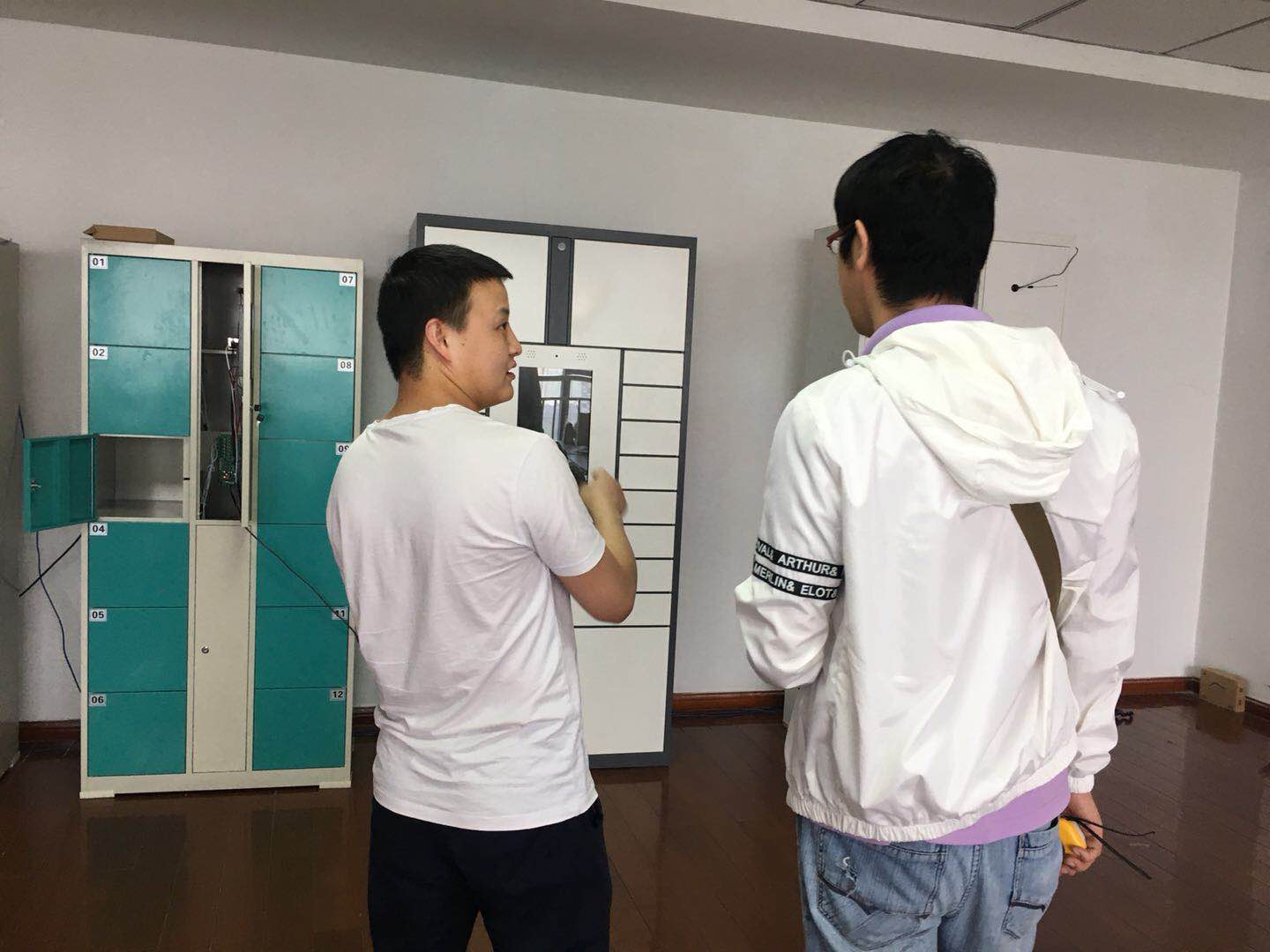 下图我们销售经理正在给上海客户介绍电子寄存柜的功能,选用的材质。