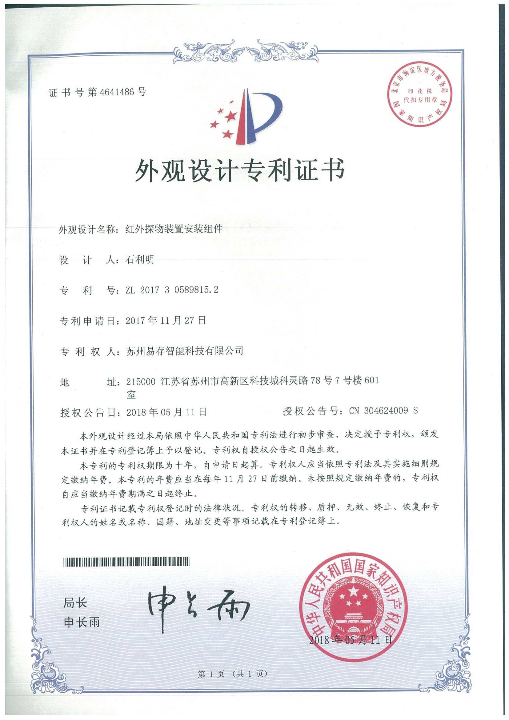 外观设计专利证书:红外探物装置安装组织