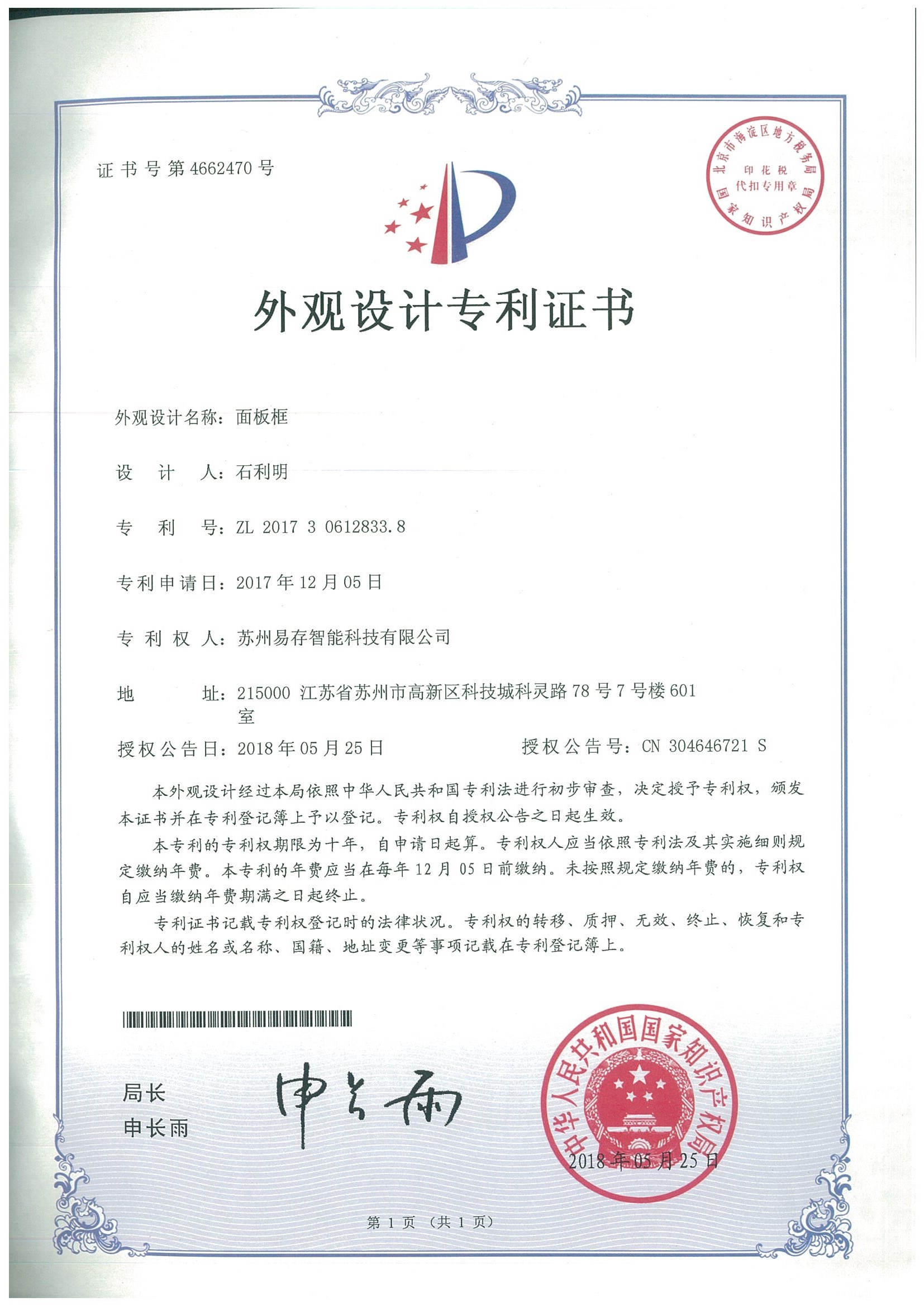 外观设计专利证书:面板装