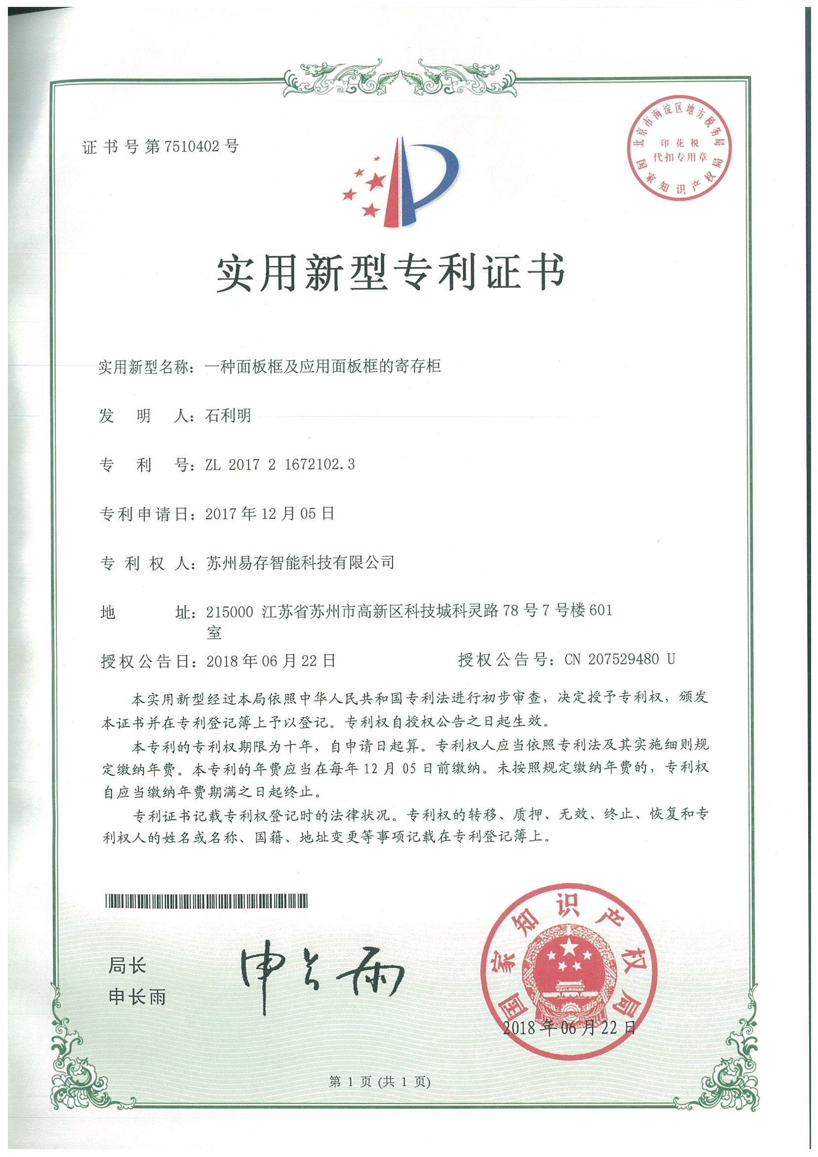 实用新型专利证书:一种面板框及应用面板框的寄存柜