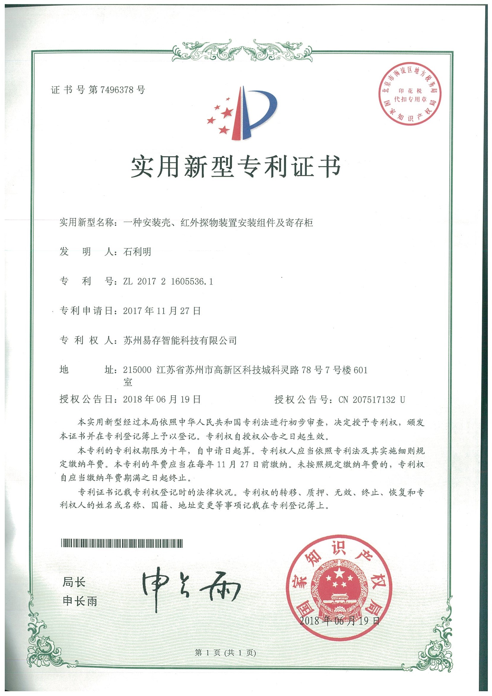 实用新型专利证书:一种安装壳、红外探物装置安装及寄存柜