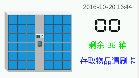 刷卡寄存柜的界面上会显示如下图的样式,用来显示寄存柜柜号、可使用寄存柜数量、时间、此柜存包的状态,寄存柜存取提示等,方便快捷。