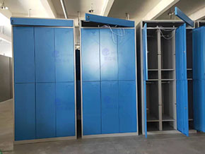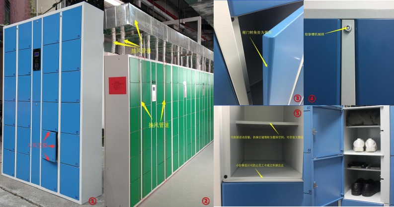 6、 抽风除臭 :柜子内部设计有通风孔和通风管道,柜子顶部设计有通风管,通风管与箱格内的通风孔相通,顶部的通风管可与企业工厂抽风系统连接,通过抽风系统抽除箱格内的臭味和湿气,保持柜子和摆放区域空气清新。